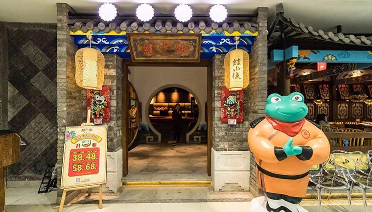 蛙來(lái)噠:以炭燒牛蛙為產(chǎn)品核心,品牌有先發(fā)優(yōu)勢(shì),采購(gòu)有規(guī)模優(yōu)勢(shì),門(mén)店眾多,到2019年年底將突破200家。由于創(chuàng)始人之前屬做烤魚(yú)出身,門(mén)店風(fēng)格始終是工業(yè)風(fēng)。整體形象以蛙超人的形象為IP,品牌形象方面特色不鮮明。