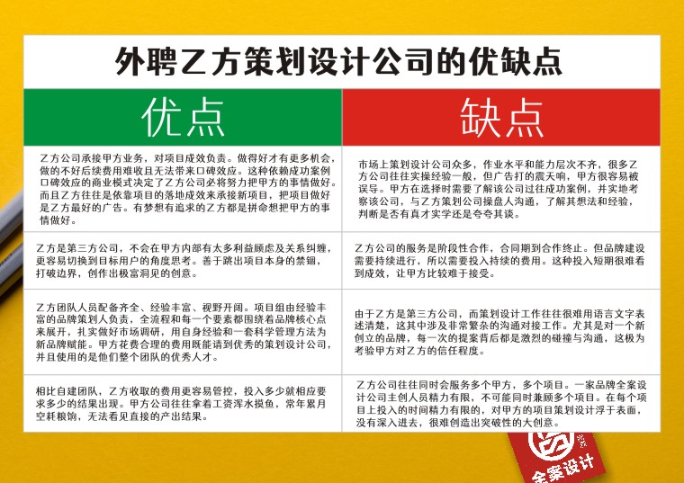 缺點4:乙方公司往往同時會服務多個甲方,多個項目。一家品牌全案設計公司主創(chuàng)人員精力有限,不可能同時兼顧多個項目。在每個項目上投入的時間精力有限的,對甲方的項目策劃設計浮于表面,沒有深入進去,很難創(chuàng)造出突破性的大創(chuàng)意。