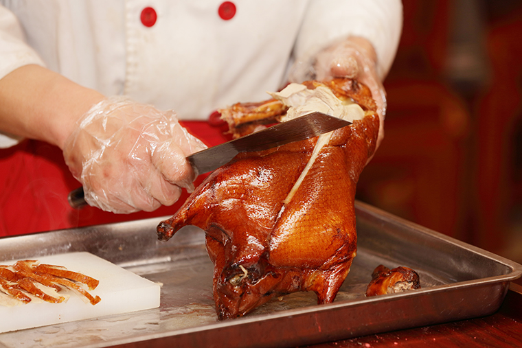 于是,我們推導出這么一條邏輯線:地道的北京烤鴨技法源自宮廷御廚,御廚烤好的鴨子呈現油光明亮的暗紅色,就如同北京故宮的宮墻紅,鮮明奪目。