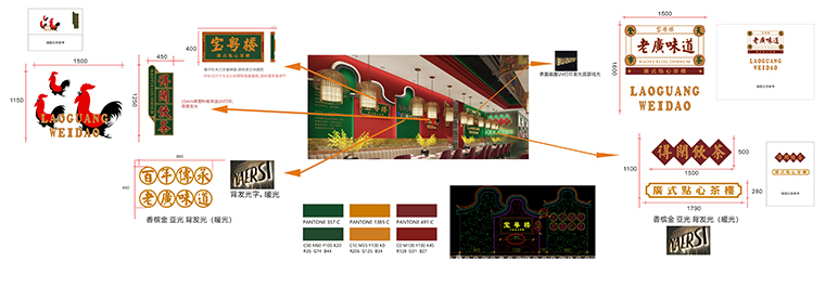 ”這一識(shí)別度高,歷史感強(qiáng),且符合點(diǎn)心茶樓這一品類(lèi)特性的匾額樣式設(shè)計(jì)變化成寶粵樓的標(biāo)志LOGO圖形。綠色的匾額,金色的字體,用金字招牌的形式把寶粵樓的歷史內(nèi)蘊(yùn)完美表現(xiàn)出來(lái)。我們將寶粵樓的主體色定為紅色和綠色。其中紅色使用的面積最大,大量出現(xiàn)在空間裝飾裝修中,綠色則主要出現(xiàn)在各種物料應(yīng)用設(shè)計(jì)中。深綠色在老廣州西關(guān)的古建筑中,出現(xiàn)的頻率很高,是非常具有歷史厚重感的一種色彩。
