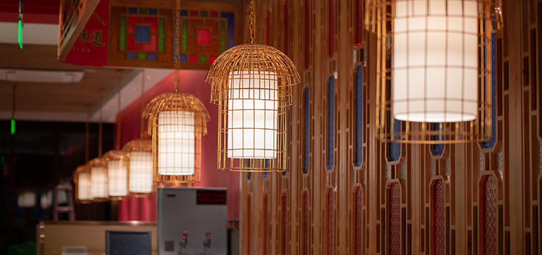此次寶粵樓的空間軟裝陳列設(shè)計(jì),涵蓋了餐桌餐椅、收銀臺(tái)、服務(wù)臺(tái)、收納柜、沙發(fā)坐具等餐飲家具;空間吊燈及照明裝飾設(shè)計(jì);裝飾品、雕塑擺件、工藝品、畫(huà)藝軟裝以及最重要的品牌定制裝置軟裝。家具的主色調(diào)與品牌的主色調(diào)保持一致,椅子的款型也選用了廣州西關(guān)老式茶樓中的椅子;我們所使用的吊燈模仿鳥(niǎo)籠造型就是為了傳遞廣州老茶客提籠遛鳥(niǎo)飲早茶的悠閑幸福生活,和整個(gè)品牌文化高度契合;