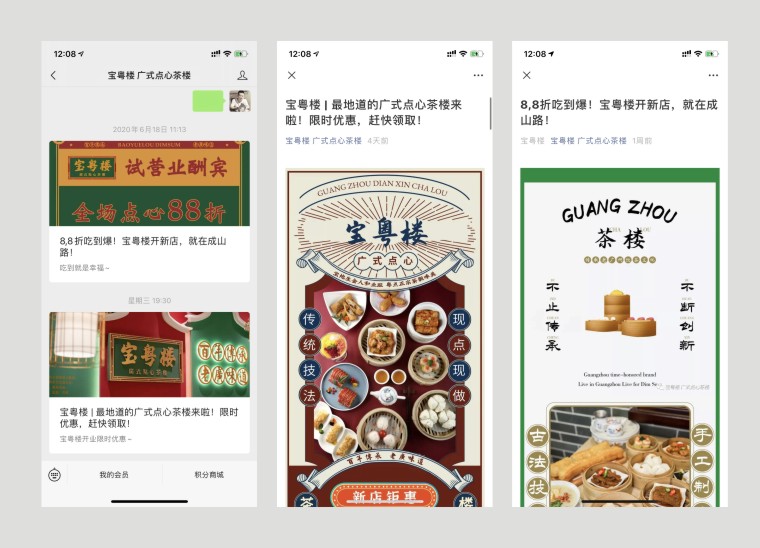 其他的VI如店內(nèi)日常運(yùn)營(yíng)的物料系統(tǒng),導(dǎo)視系統(tǒng),推廣廣告系統(tǒng),品深餐飲設(shè)計(jì)團(tuán)隊(duì)力圖整體空間與品牌完整統(tǒng)一,精細(xì)到連顧客接觸最多的墊餐紙、點(diǎn)餐單、使用的功夫茶具、員工的工衣胸牌、圖片的風(fēng)格,全部統(tǒng)一在寶粵樓的品牌文化體系之內(nèi),給顧客以視覺(jué)整齊劃一又靚麗多變的美學(xué)感受。