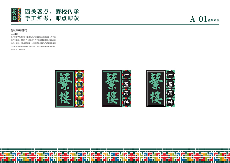 蘩樓兩個字在日常中很少看見,認識的人不多,但是一旦認識了,識別度非常高。品深設(shè)計方法論認為:優(yōu)秀的標識logo首先應(yīng)該傳達品牌屬性,其次是承載品牌的文化,再次是很容易識別和傳播。我們提取了西關(guān)文化中最常見的廣式花窗(也稱滿洲窗)作為標識的主圖形,并加入“一盅兩件”作為品牌輔助說明,強調(diào)品牌的行業(yè)屬性。