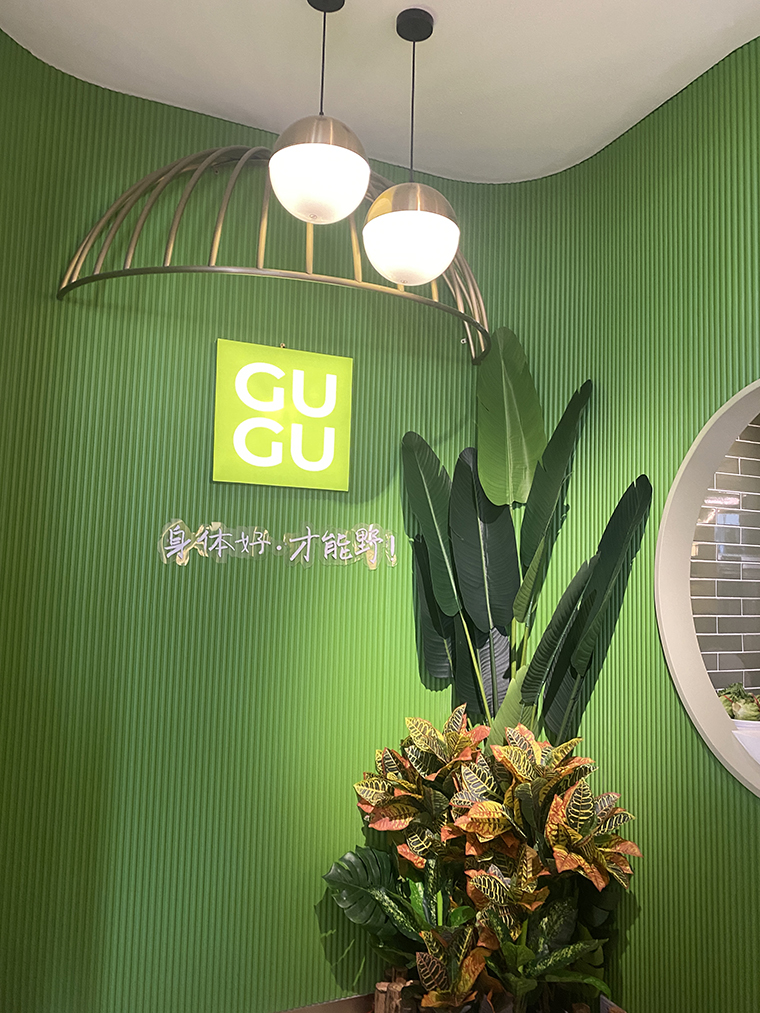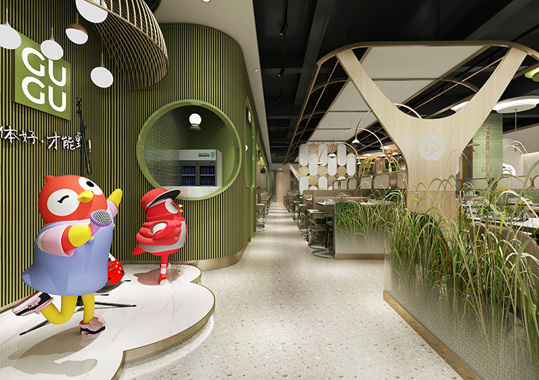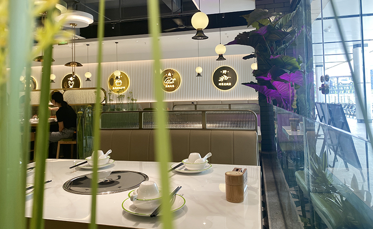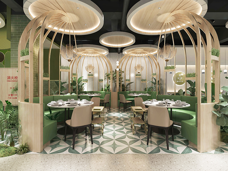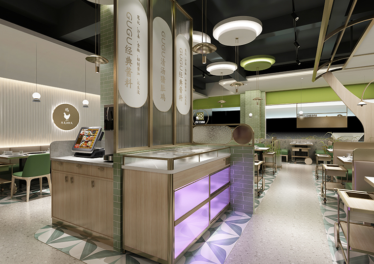 為了營造自然,清新,通透的空間感受,體現咕咕豬肚雞清湯養生特點,品深餐飲裝飾設計團隊使用了淺木色半包鳥籠造型,隔斷中遍種仿真綠植,墻面以淺白色手工磚突出了發光不銹鋼廣告畫面的內容,簡約又具有鮮明的廣告效果,很好地將咕咕豬肚雞的品牌文化、品牌形象及品牌內容在空間中展現出來了。