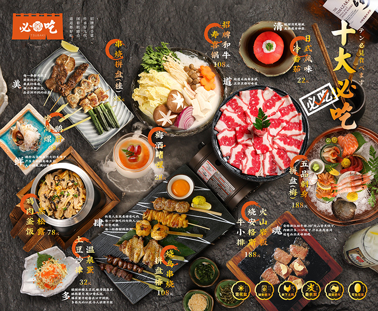品牌記憶點:日本京都風格門頭設計+玉椿標識及家徽+燒鳥手繪畫面+四大主色調。